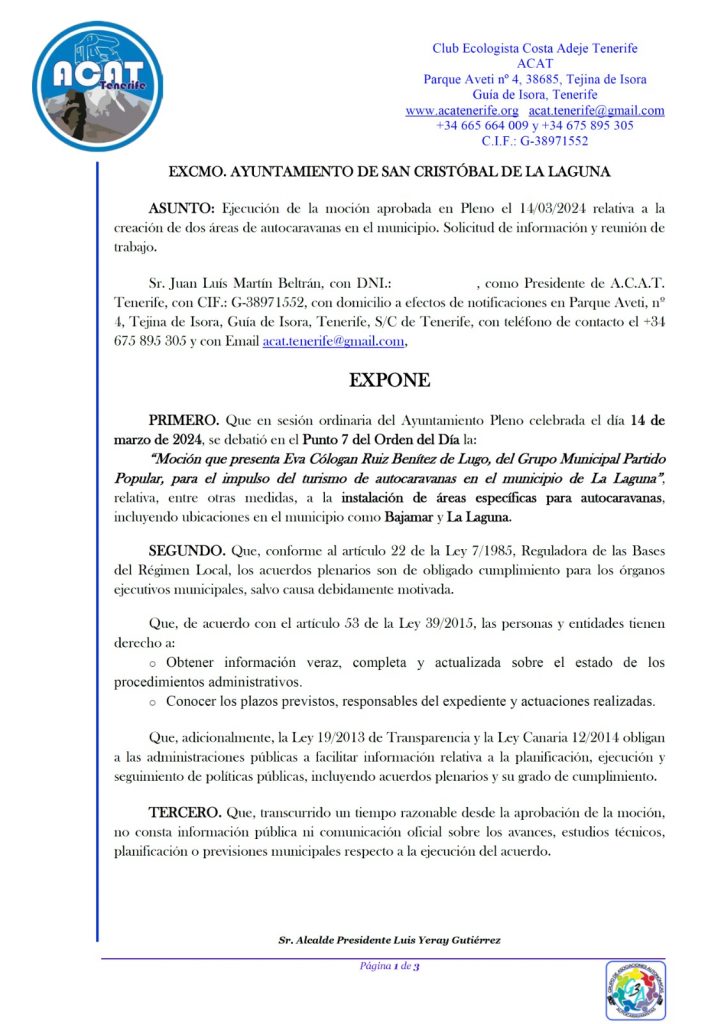 Desde ACAT Tenerife hemos registrado oficialmente una solicitud dirigida al Excmo. Ayuntamiento de San Cristóbal de La Laguna, para pedir información y una reunión de trabajo con el objetivo de impulsar la ejecución de la moción aprobada en Pleno el 14 de marzo de 2024, relativa a la creación de dos áreas de autocaravanas en el municipio.