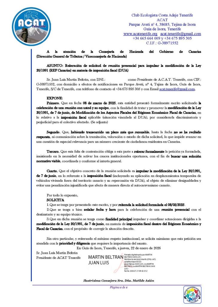 - Solicitar una reunión presencial con la Consejera y su equipo técnico para impulsar la modificación de la Ley 20/1991 (REF Canarias) en lo relativo a la imposición fiscal del DUA, que afecta al autocaravanismo canario cuando los vehículos vivienda permanecen más de 6 meses fuera del archipiélago, generando una penalización que consideramos injusta y discriminatoria.
