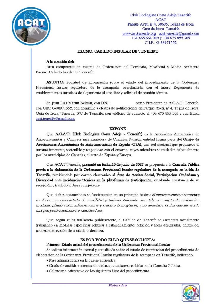 📌 Hoy hemos presentado formalmente escrito ante el Cabildo de Tenerife (Área de Ordenación del Territorio, Movilidad y Medio Ambiente) solicitando información actualizada sobre la Ordenanza Provisional Insular reguladora de la acampada.