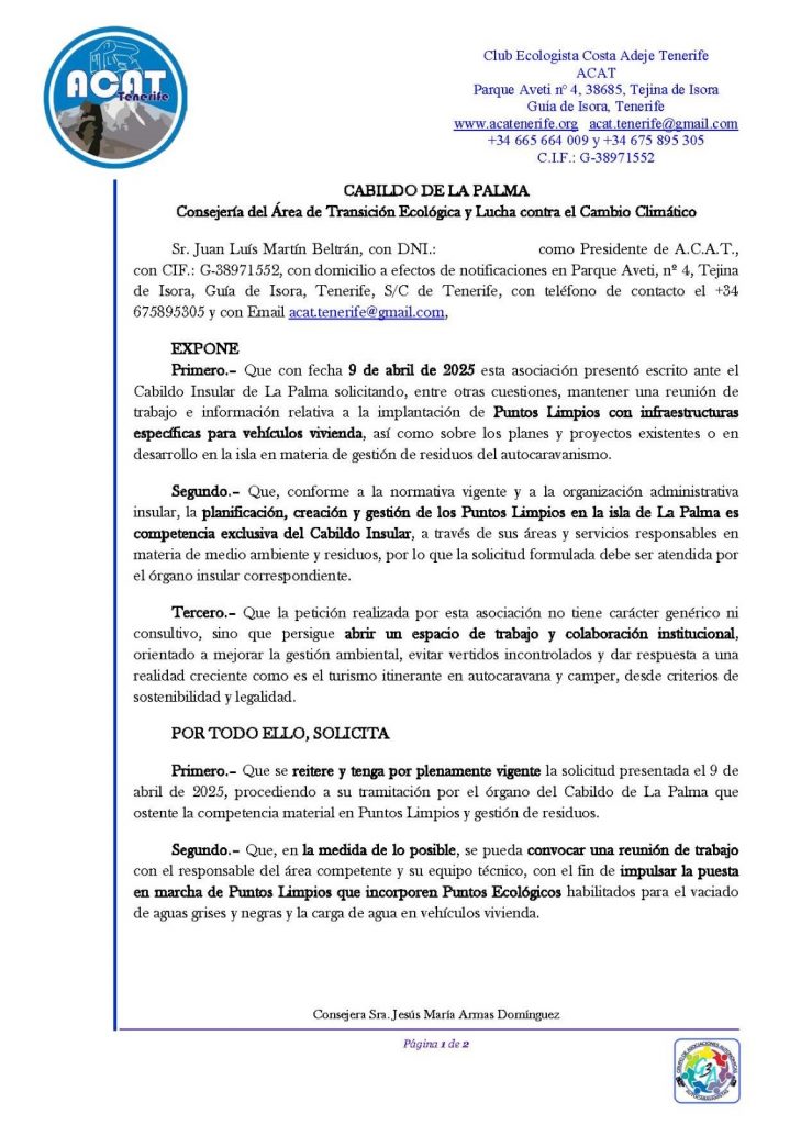 📌 Estimados/as Socios/as, desde ACAT Tenerife les informamos que hemos presentado ante el Cabildo Insular de La Palma una nueva solicitud reiterativa, retomando el escrito que ya registramos el 9 de abril de 2025, al no haber recibido respuesta efectiva hasta la fecha.