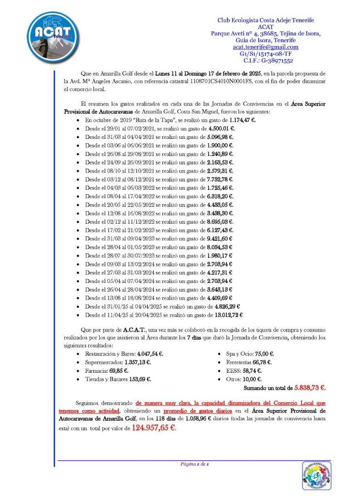 Hoy hemos trasladado por Sede Electrónica al Ayto. de San Miguel de Abona, el Informe Económico de Gastos, los cuales durante las 26 Jornadas de Convivencia celebradas en el Área Superior Provisional de Amarilla Golf, en San Miguel de Abona, Tenerife, los autocaravanistas y socios de ACAT Canarias hemos generado un impacto económico directo de gran relevancia.